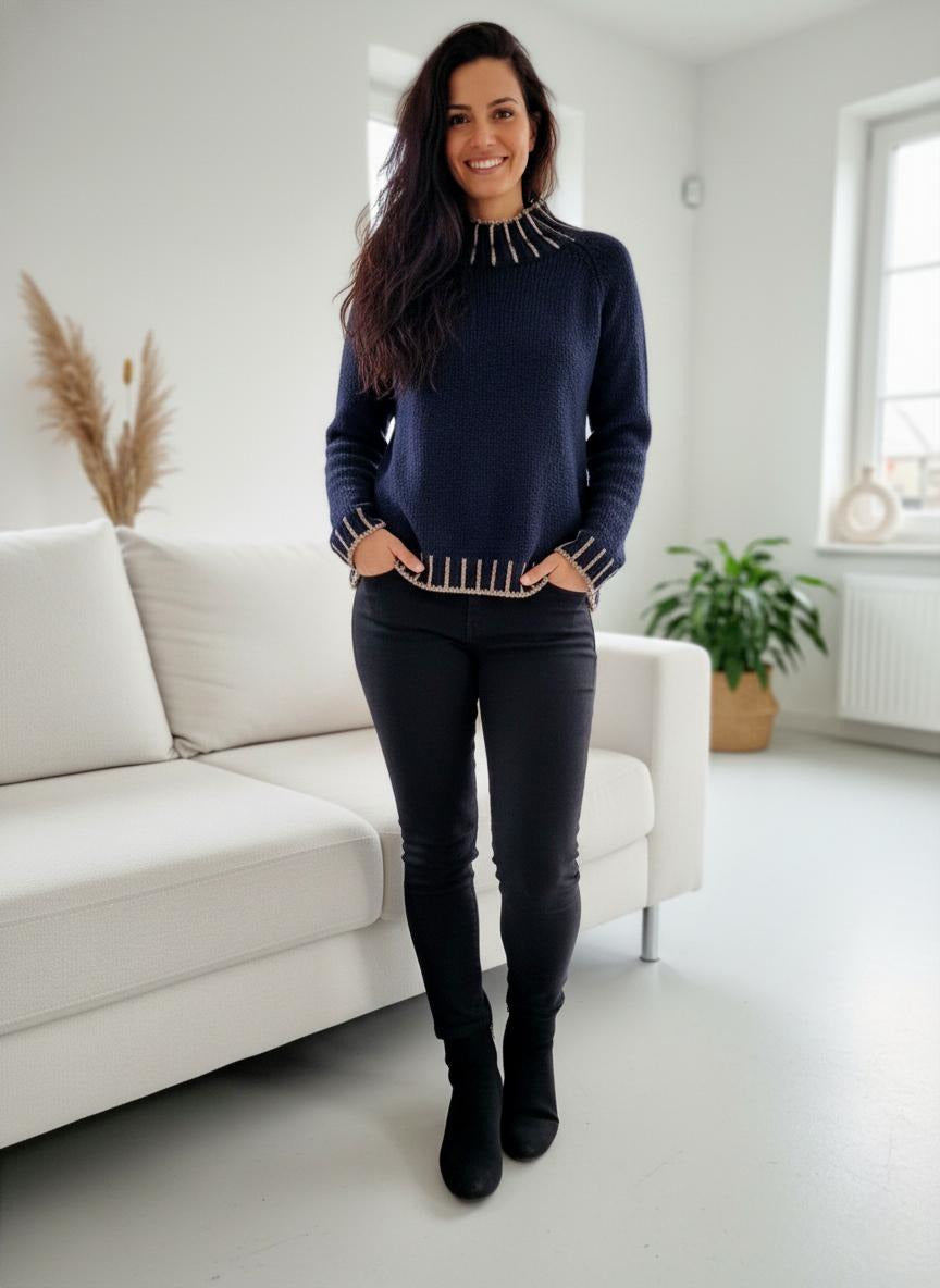 • El Jersey Marina combina calidez y simplicidad en un diseño que resalta por sus hermosos colores cuidadosamente seleccionados. Su tejido suave ofrece confort durante todo el día, ideal para quienes buscan elegancia sin complicaciones.